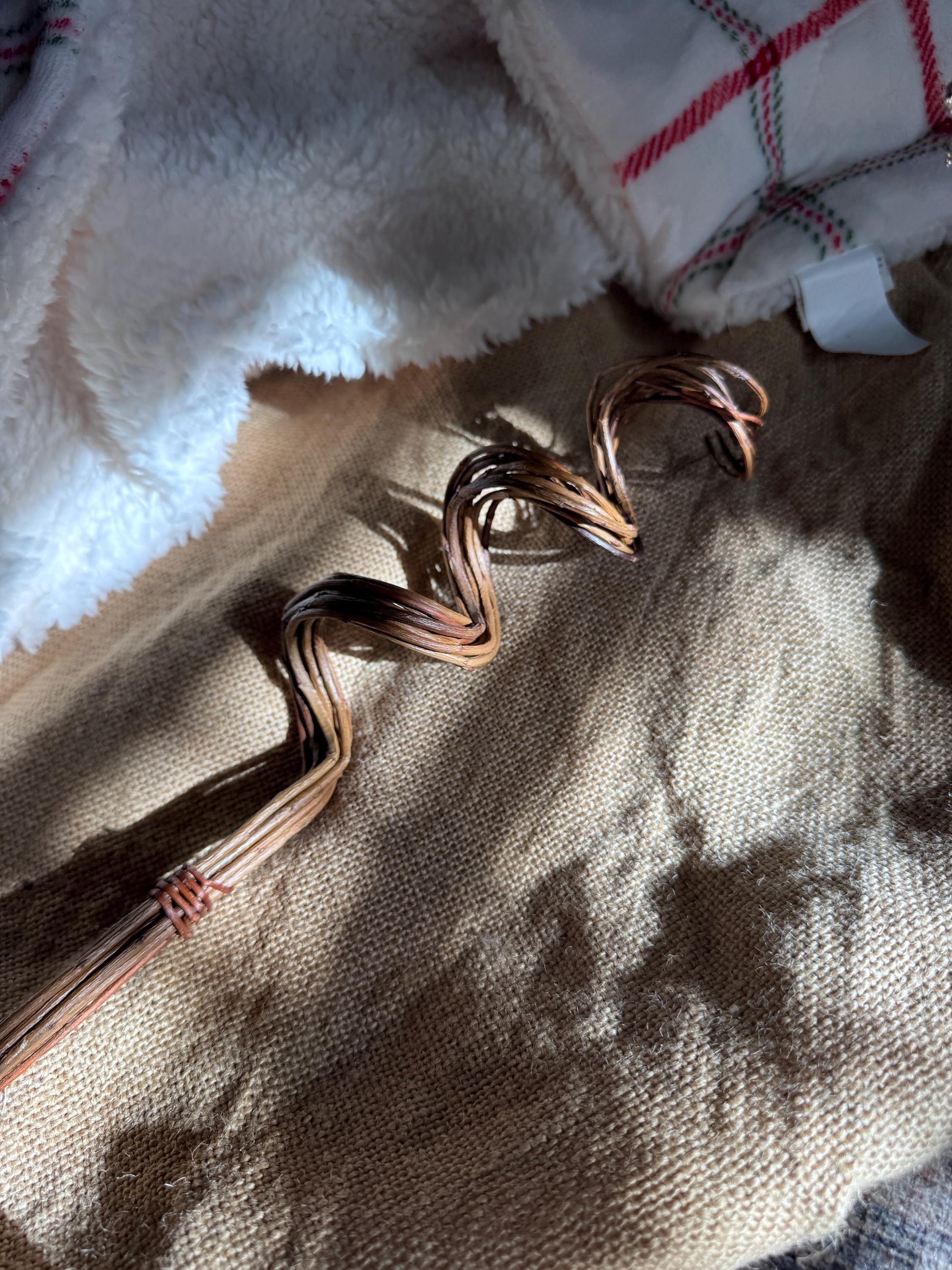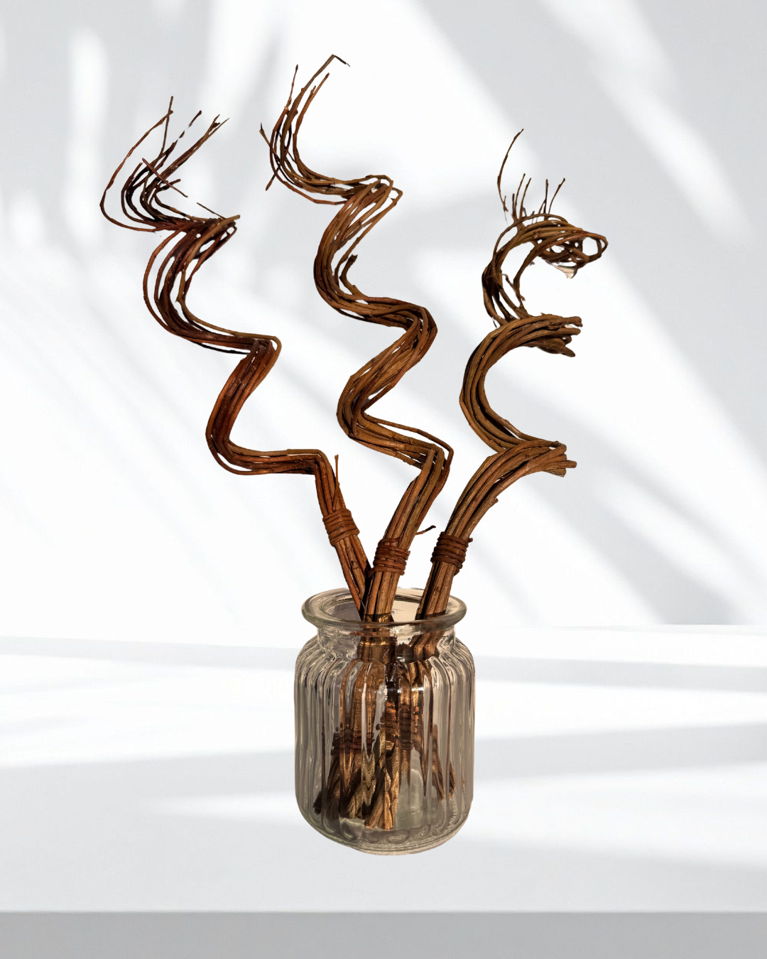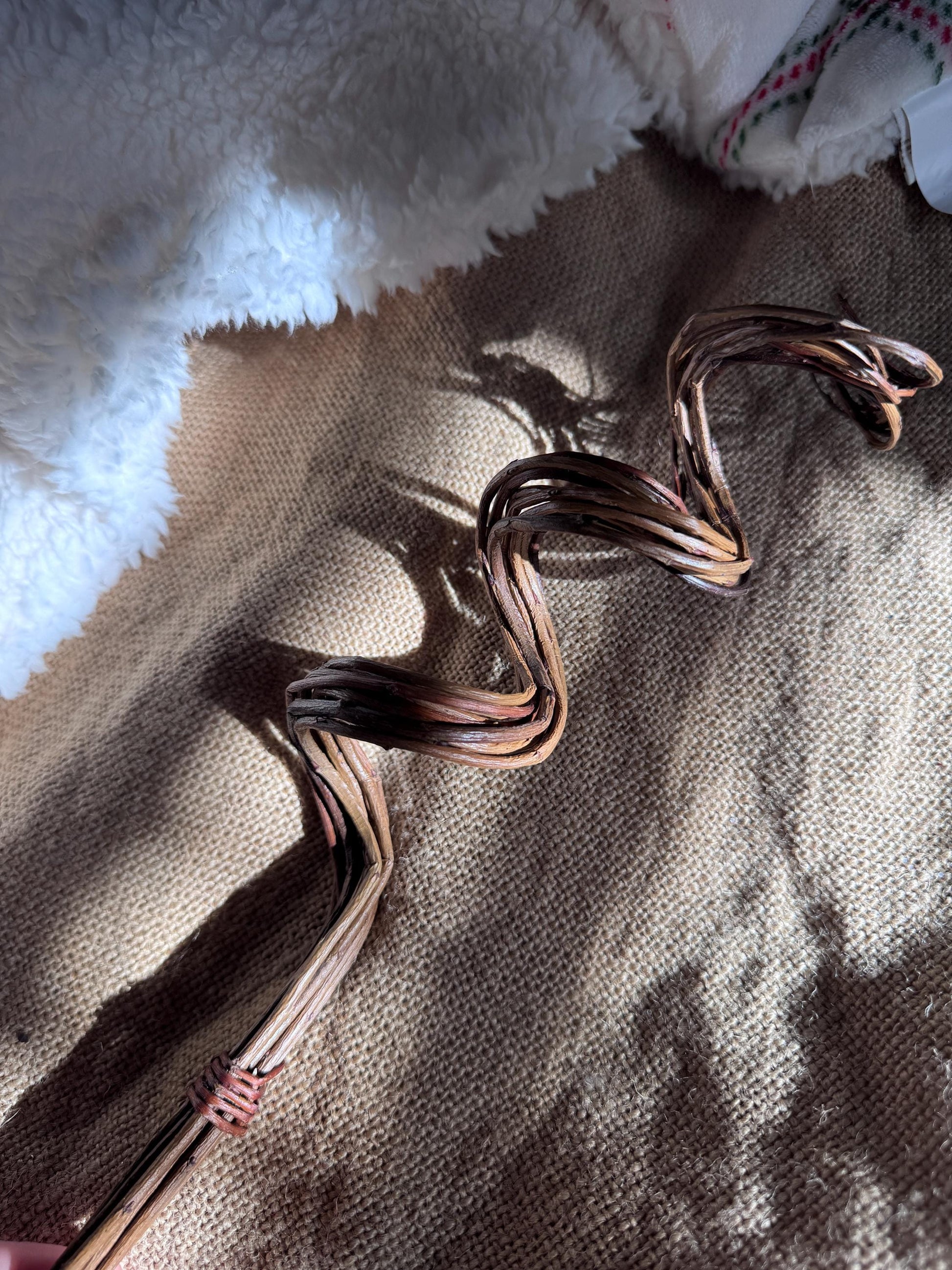• Created by bundling long willow strands and shaping the signature Curly Q top